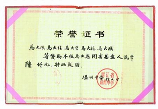 马大猷说,1978年回国探亲,两个哥哥为国家当时的落后深感忧虑。此后五兄妹以父亲的名义建立图书基金,多次为温州中学捐款,到了1989年,累计上万元的款项在当时已经不是小数目。