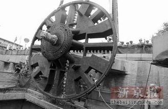 昨日,北京轨道交通机场线施工现场,吊车吊着刀盘慢慢往下移动。本报记者薛珺摄