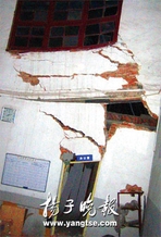 车间办公室墙面断裂,门框倾斜。