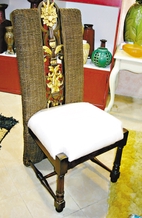 麻绳餐椅:富有东南亚风情的麻绳餐椅,带着强烈的热带气息,椅子脚上是旋木的雕饰,自然简单,椅子背面镂空的花朵雕饰,据说原本是原木色,后来涂上故意作旧的土黄色,反而更受买家的欢迎,带着金属的质感,却原来只是涂上了一层漆。