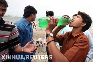 8月19日,在印度孟买的马希姆海滩,一名男子喝下变“甜”的海水。马希姆海滩近日出现“海水变淡水”的“奇迹”,吸引了成千上万名闻讯而来的居民争相饮用据说可以治病的“圣水”。但当地官员指出,这并非圣人制造的奇迹,而是大量降雨冲淡了海水。 新华社/路透