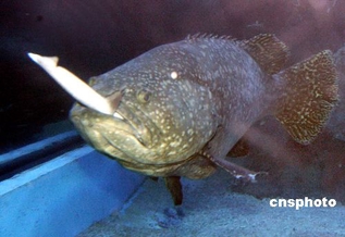 资料图:3月29日,福州市左海公园海底世界刚从海南购进的三只白鳍鲨中,有一只1米长的白鳍鲨被一条巨石斑鱼生生地吞吃了。中新社发 杨婀娜 摄