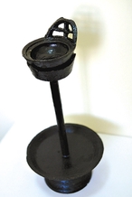 记得我收藏的第一盏油灯是在西安买的“婆婆灯”,铁铸而成,是上世纪初北方农村日常使用的一种豆形灯,当时大约10个铜元就可买到。整盏灯一次成形,看起来简单,设计却十分合理,分灯碗、灯托、灯盘三个部分,灯碗用来盛油放灯芯,下面的灯托用来接滴下的灯油,而下面的灯盘则是第三重保护,即使灯搬来搬去,也不用担心灯油会滴在桌面上。这种灯在北方农村也是姑娘出嫁时的嫁妆之一。