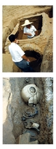 吉林大学考古系高材生、考古队长张志成将记者领到前牧2号墓前,“这是一处东汉墓葬,我们发现了漆棺、料珠、铜泡钉及大量的陶器组合。”他介绍说,此墓长宽皆为3米左右,为男女合葬,其中女子的棺椁因为墓室进水,发生了漂移,位置稍有挪动。整个墓室墓门明显,尸骨虽已腐烂,但瓮、灶、井、奁、罐、盆等随葬品齐全,女子颈部还戴着玻璃、玛瑙、骨珠穿成的项链。“能够清理出完整的汉代漆棺木遗址,连漆棺上的红色都鲜艳如初,在大连地区是难得一见的。”记者看到,已经腐烂的棺椁上,果然残留着几道红漆,让人遥想2000年前的鲜艳。