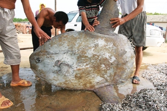 这条鱼是旅顺口区渔民拉海蜇时拉上来的,重达130多公斤,渔民们都不认识,专家称是罕见的翻车鱼