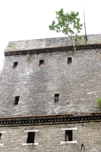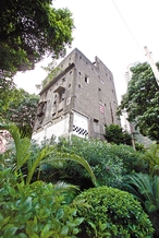 仓库在主楼后面,两个建筑虽相连,但建筑风格迥异:一是两者的高度存在有一定的落差,仓库远高于主楼,规模宏大;二是主楼的建筑线条非常柔和,注重细节和美感,石刻、雕花非常精细,而仓库则线条粗犷,比较注重实用性,远看形似炮楼,又似一个巨大的长方形盒子,棱角鲜明,除了墙上保留着的数十个大小不一的窗眼外,没有任何多余的修饰,显得庄重而神秘。