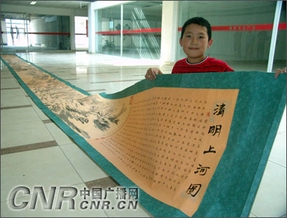 中广网北京8月29日消息(记者黎政祥 实习记者康怡 通讯员郎丰杰) 记者近日从京郊延庆了解到,一个10周岁的孩子,半年来持之以恒,用自己业余时间描摹出了一幅长15米的《清明上河图》。