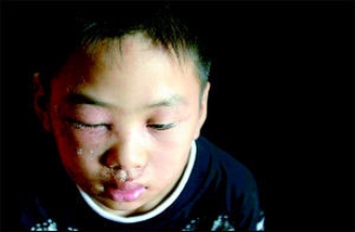 在双桥区太平村,11岁小男孩陈睿的眼皮也被虫子叮了,现在肿得看不到东西。