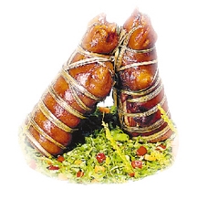 第四是捆扎,将腌渍好的猪肉片肥瘦相间码好,塞进剔去大骨的猪腿中,用猪腿皮包裹好,再用一种韧性很好的水草将猪腿横着裹扎严实。用水草裹好的“猪蹄”跟原来的猪蹄的样子很相似,从背面看几乎看不出什么差别。
