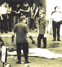 ▲工作人员准备将尸体抬走。