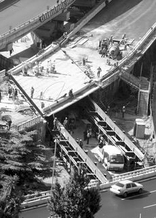 桥体水平推进完工后,工程人员将马上开解新梁和滑轨支墩之间的联系,使新梁改由千斤顶支撑,为新桥梁的竖向落梁做准备。昨天上午8点多,大部分工人辗转桥下拆除支撑滑道的钢架,为桥体竖向就位做准备。另有小部分工人开始着手清理桥体与二环路面间的两个缝隙。两道桥缝都有半米宽,深约一米。西直门立交桥改造工程项目经理张全忠介绍说,桥体竖向就位完成后,工作人员将在两个桥缝里浇筑混凝土,其作用一方面是将桥体固定在路面上,同时也给桥体以一定热胀冷缩的空间。