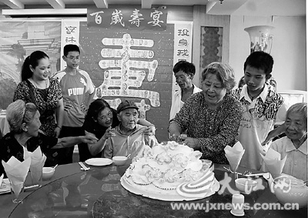 7月23日,兴国县委、县政府在将军宾馆为老红军王邦忠举行盛大的百岁寿宴。巨大的“寿”字、多彩的鲜花把宴会厅装扮得喜气洋洋,许多群众都自发地赶来为王老献花祝寿。王老显得比平常更有精神,不停地“哼哼”有声。站在一旁的老伴陈侨雄做“翻译”:老头子心里明白着呢,他在向你们说谢谢!
