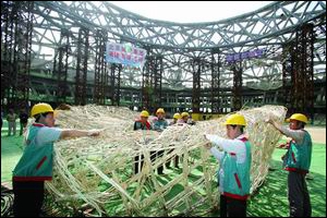 昨天,北京城建集团职工在鸟巢中央,用树枝精心编织了一个小“鸟巢”。图片远景可见支撑鸟巢的钢架。本报通讯员 黎方益 摄