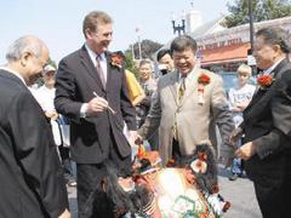 昆士市长费兰(左二)参加华联会成立典礼,并为祥狮点睛。(美国《世界日报》图 记者李静雯摄)