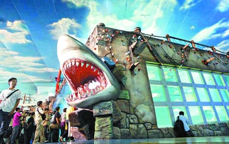 图五:总面积1000平方米的巨型天幕上,绘制着海天一色的瑰丽景象;天幕下,一条栩栩如生的鲨鱼张开巨口迎候游人……这就是北京海洋馆将在“十一”奉献给游客们的崭新鲨鱼馆。