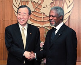 2006年9月22日,安南(右)与潘基文在联合国总部会晤。 新华社