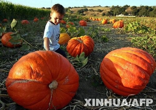 10月8日,在美国加利福尼亚州的一块南瓜地里,一个3岁的小男孩看着巨型南瓜。随着万圣节的临近,美国人纷纷购买南瓜制成灯笼,以迎接这个西方重要节日。 新华社/法新