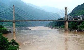 很快,车子过了杉栎树村,又沿陡峭崎岖的盘山公路小心翼翼地向下盘旋。眺望车外,金沙江两岸崇山迭岭,绝壁断崖;金沙江江险水急,惊涛拍岸。终于车子开到了江底,又一番景象映入眼帘:江面开阔 ,江水平缓,一座气势宏伟的拉索桥横于江中。李副部长告诉我们:"前面就是皎平渡"。