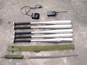 警方缴获的仿左轮长枪、霰弹枪以及对讲机刀棍等作案工具。