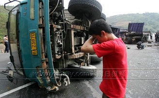 据橘红色运煤货车的驾驶员说,看到前方堵车他连忙停车,突然被后面的客车追尾,睡在后铺的副驾驶都滚了下来。人们救下客车上的伤者和乘客后,120急救车火速向医院驶去。下午2时许,在宜良县人民医院,医生告诉记者,急救人员对伤势最重的55岁妇女进行了40多分钟的紧急抢救,但伤者最终不治身亡。