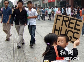更有甚者,有的行人当场自发制作“抱抱团”纸牌加入活动;有些行人手持dv或者是手机,全程跟拍“抱抱团”成员的拥抱过程;更多的人询问“抱抱团”的群号码,申请加入“抱抱团”。这一切发生在10月21日下午,长沙黄兴路步行街头。