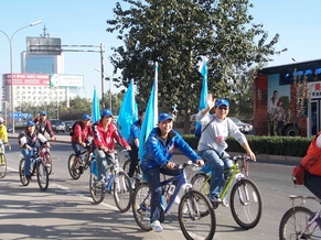 昨天,来自清华大学、北京交大、北京工商大学等高校的近200名志愿者脚蹬自行车,头戴印有“少开一天车”字样的蓝帽,自行车上插着印有“绿色出行奔向奥运——少开一天车在行动”的彩旗,从中央电视塔出发一路骑行到天坛公园,向市民倡议11月2日、3日不开车,4日、5日少开车。沿途,崇文、宣武、丰台等区由公务员、企事业职工等组成的骑行队伍也不断加入其中。曾昀文何万军摄RJ183