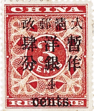 “红印花加盖”是海关用的票据,当时国家刚刚开始开办邮政,因为还来不及制作邮票,便将海关的邮票用来改值。原票价从1分到5元不等,发行数量很大,达到几十万张。
