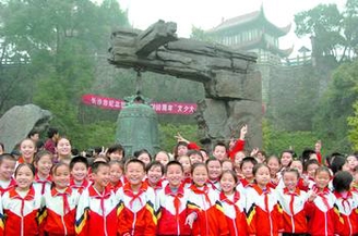 2005年11月12日,湖南长沙“文夕大火”警世钟雕塑落成仪式举行。修业小学五年级一班的学生在警世钟前快乐留影。国新供图