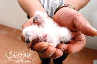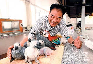 阿kent来自香港,养鹦鹉已经有十来年的历史了。几年前,出于对鹦鹉的热爱,他特意到新加坡学习养鹦鹉的先进技术,回国后创办了“欢乐鸟园”。“在香港,朋友们都叫我雀痴。”在育雏室里,阿kent打开孵化箱,用手掌捧起一只刚刚出生不久的雏鸟,用一根针筒状的饲养器灌上自制的“独家”营养液,轻轻地注入小鹦鹉的嘴里。
