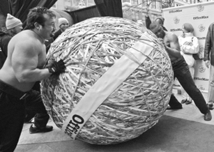 不过,美国俄勒冈州的史蒂夫·米尔顿,用橡皮带缠绕出一个2000多公斤重、近两米高的大球,刷新橡皮带缠球吉尼斯世界纪录。
