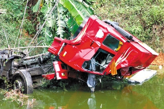 本报茂名讯 (记者关家玉 通讯员黄楚凡、柯达摄影报道)昨日早上7时,高州潭头潭丹公路孔塘坡路段发生一起交通事故,一辆装有20吨煤焦油的油罐车疑因闪避另一辆油罐车时处理不当,翻进路旁一口离路面8米高、水深约4米多的鱼塘里,造成驾驶室内的2名司机惨死。