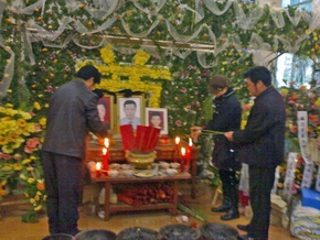 12月2日,文建刚及其妻子和孩子的灵堂里,骆绎不绝的人前来拜祭。图片来源:广州日报