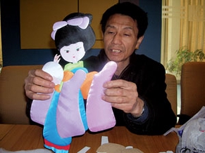 于经理告诉他,制作那个“和服娃娃”很简单,就是把太空棉和布按照几片硬纸模板的形状粘在一起,然后画上眼睛、鼻子和嘴就可以了。每制作一个给加工户手工费50元,一般来说加工户一个人一天就可以制作出来两个。