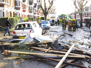 英国伦敦一处宁静的郊区7日午间突遭龙卷风袭击。这场怪风仅持续了20秒时间,却造成数人受伤和严重经济损失,一些房屋的屋顶被卷走,围墙倾倒,树木被连根拔起,汽车被吹得底朝天,垃圾箱被刮到空中,街头一片狼藉。