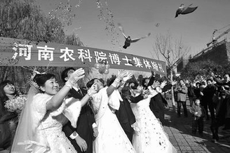 三对新人的学位都是“重量级”:新郎吴仁海,华南农大博士,新娘段云是他的校友,麦虫防治专业硕士;新娘李国平,中国农大博士,新郎苗进是中国农科院在读博士;新娘杨丽荣,浙江大学博士,新郎贾耀祺毕业于名牌大学考古专业。