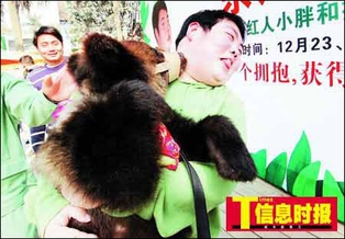 昨日,具有独特的幽默外形的小胖在抱抱团的比赛现场,充分发挥出自己的搞笑本色,亲密和游客合影,多次摆出自己的经典POSE——脸向左侧下倾45度,露出委屈,无辜的眼神,逗乐了所有现场观众。而昨日的“我要抱抱”活动最高潮则是在最后一个活动中掀起,一名身材苗条的女游客在大家的见证下抱起了体重达到200斤的小胖,全场游客都为之叫好。