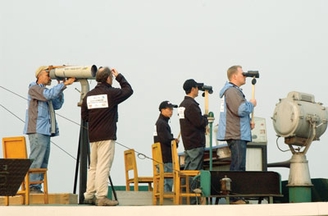 在7倍望远镜的后面,有一台外号“大眼睛”的25倍望远镜,这台售价超过10万美元的重型装备由“独立观察员”操纵使用。“独立观察员要独立观察。即使他们发现动物也不能对其他观察者宣布或有任何的暗示。”王小强指出每条船上的两套系统各有职守,自主运行。