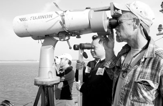 在7倍望远镜的后面,有一台外号“大眼睛”的25倍望远镜,这台售价超过10万美元的重型装备由“独立观察员”操纵使用。“独立观察员要独立观察。即使他们发现动物也不能对其他观察者宣布或有任何的暗示。”王小强指出每条船上的两套系统各有职守,自主运行。