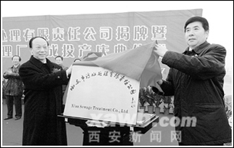 省委常委、市委书记孙清云,市委副书记、代市长陈宝根为西安市污水处理有限责任公司揭牌。(记者李福民摄)