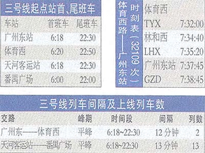 广州地铁编制了三号线全线运营时刻表,目前各站进出口都贴有属于各自站点的时刻表。时刻表中列车按两条交路运行,其中广州东站———体育西的交路行车周期为24分钟,单程为12分钟,行车间隔为12分钟;天河客运站———番禺广场的交路行车周期为169分钟,单程为84.5分钟;行车间隔为13分钟。例如:天河客运站———番禺广场的首班车到达大石站时间是早上7∶08,末班车为23∶20;番禺广场———天河客运站在大石停靠的首班车是早上6∶21,末班车是22∶21。列车时刻表显示共运行344列次/日,载客能力达到21.1万人/日。