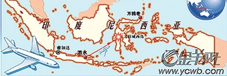 图:客机从东爪哇岛泗水起飞,计划飞往苏拉威西岛北部的万鸦老,在苏拉威西岛失踪。