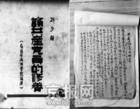 图为,刘少奇所著《论共产党员的修养》的封面;右图,《论共产党员的修养》的部分手稿(资料照片)。新华社发
