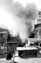 本报讯 (记者张强 摄影王燕、陈枫)昨日下午2时45分左右,紧挨荔湾区清平药材市场的调源上街15之5号突冒大火。火种来自一楼的83岁谭阿婆家,有目击街坊称火灾的原因是阿婆在家里烧纸元宝,而阿婆告诉记者她是因为擦火柴取光过失引火的,火灾导致两人丧生。