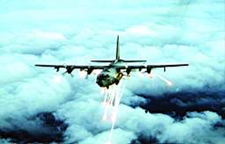 AC—130型飞机是4引擎的涡轮螺旋桨飞机,装备有40毫米口径、每秒120发子弹的重机枪以及一门105毫米口径的火炮,主要用于打击分散在地面的武装人员。