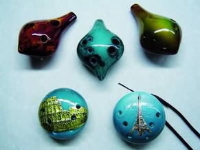 孙建刚制作出的六七孔陶笛造型多姿多彩,有五颜六色的热带鱼、小海豚、12生肖、贝壳,还有扁圆形,上面镶嵌艾菲尔铁塔、古罗马斗兽场、三角梅、白鹭等各种图案的。