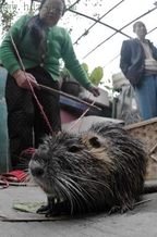 居民介绍,中午2时许,有人发现河面上有一只巨大的“老鼠”在游泳,吓得惊叫起来。“听说环境污染会引起动物的变异,难道这是只变异的大老鼠?”有人跳上清淤船,用清理河面垃圾的大网将“巨鼠”捞上岸,用竹筐倒扣住。