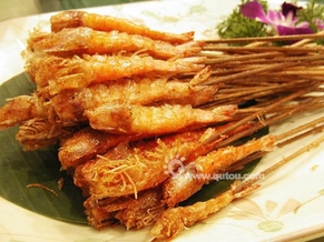 金黄欲滴的虾串,咬下去,又酥又脆,肉质特别鲜嫩,嚼劲十足。
