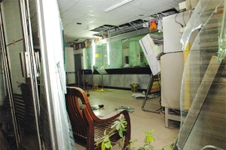 有目击者一听是扬子晚报记者从南京赶来采访,连忙拉记者到侧面一个被炸开的卷帘门缝,“这里拍摄得比较清楚。”果然,记者从这里可以清楚地看见被炸的营业厅现场。只见1号、2号柜台之间的柜台玻璃被炸开一条一人多宽的口子,顶上面的天花板隔板也被炸裂,有一条4米来长的口子;东面离柜台不到3米远的取款机也被炸坏,框架耷拉了下来;银行进门处4扇玻璃门全部破碎,玻璃屑、粉尘等撒落一地。