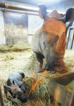 昨天早上,小犀牛开始吃奶。在这之前,母犀牛一直走动,不让小犀牛吃奶。工作人员说,生下小犀牛后,母犀牛盯着它,后退了两步,好像不认得是自己的孩子。但小犀牛开始吃奶后,母犀牛就一直守在边上,不让人靠近。有人靠近拍照,母犀牛明显情绪暴躁,试图用角顶人。