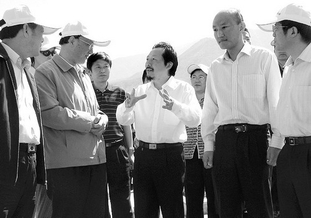 图为国家体育总局局长刘鹏(左二)视察四川米易水上运动激流皮划艇项目国家队冬训基地时听取佘振苏的科研攻关情况汇报。